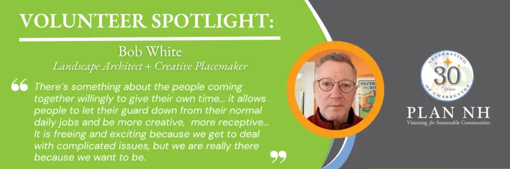 Q & A with Bob White, Landscape Architect + Creative Placemaker, Plan NH Board Member How did you first become involved with the Plan NH Charrette Program, and what drew you to volunteer in the beginning? I remember first being invited to cross the Connecticut River to participate in Plan New Hampshire charrettes in Enfield […]
