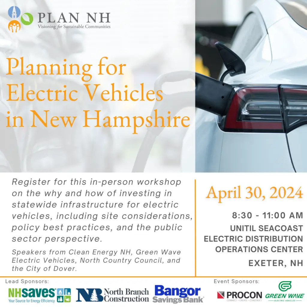 Register for Plan NH’s Spring Workshop, Planning for Electric Vehicles in New Hampshire. This in-person workshop on the why and how of investing in statewide infrastructure for electric vehicles, including site considerations, policy best practices, and the public sector perspective.