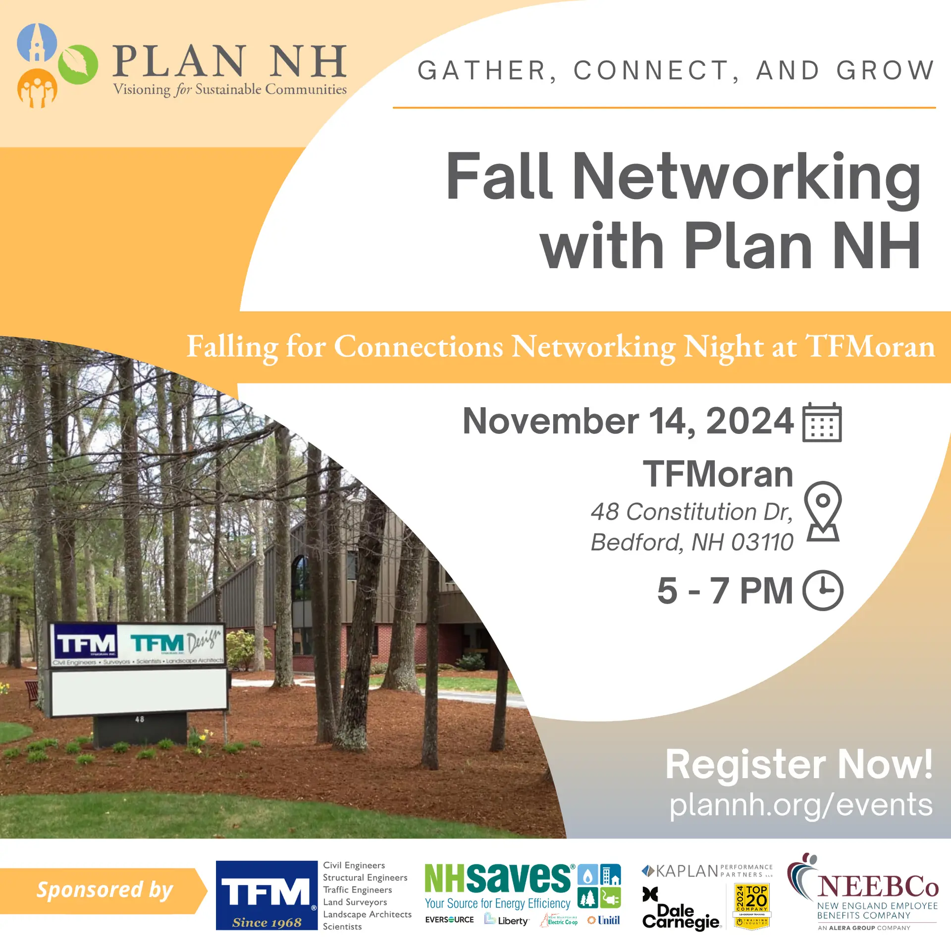 Join us Thursday, November 14 in Bedford, NH from 5:00 – 7:00 PM at the offices of Plan NH Corporate Member TFMoran. Enjoy light refreshments and catch up with Plan NH members and other colleagues from the planning, design, and development fields.